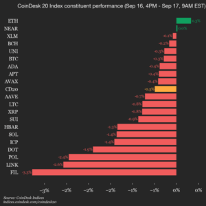 Coindesk -Index presents its daily market update and highlights the results of managers and laggards in the Coindesk 20 index. Coindesk 20 is currently trading at 4266.45, down 0.5% (-21.06) since noon. 16 A Tuesday. Two of 20 assets act higher. Leaders: ETH (+0.3%) and near (+0.0%). Laggards: File (-3.3%) and link (-2.6%). Coindesk 20 […]