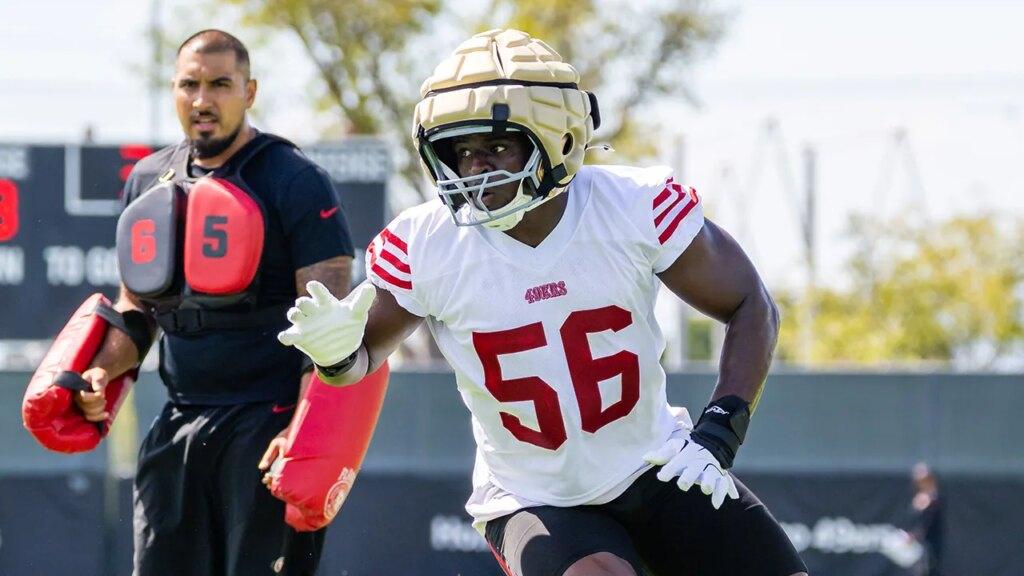 San Francisco 49ers Defensive Lineman Tarron Jackson, #56, performs a drill under the San Francisco 49ers training camp on July 23, 2025 at SAP Performance Facility in Santa Clara, California. (Matthew Huang/Icon Sportswire via Getty Images)