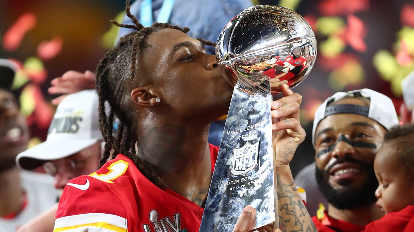 Kansas City Chiefs Broad receives DeMarcus Robinson kisses Vince Lombardi Trophy after defeating San Francisco 49ers in Super Bowl life at Hard Rock Stadium. (Mark J. Revilas/USA Today Sports)