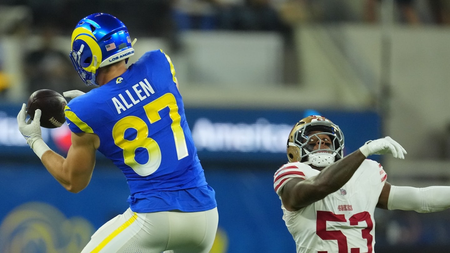 Los Angeles Ram’s tight end Davis Allen (87) catches a catch against San Francisco 49ers Linebacker Dee Winters (53) during the second half at Sofi Stadium on October 2, 2025. (Kirby Lee/Imag- Pictures)