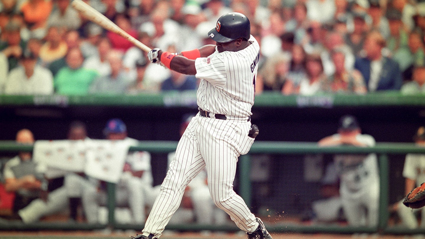 National League outfielder Tony Gwynn (19) of the San Diego Padres pitches against the American League during the 1998 MLB All-Star Game at Coors Field on July 7, 1998. (VJ Lovero/USA TODAY NETWORK)