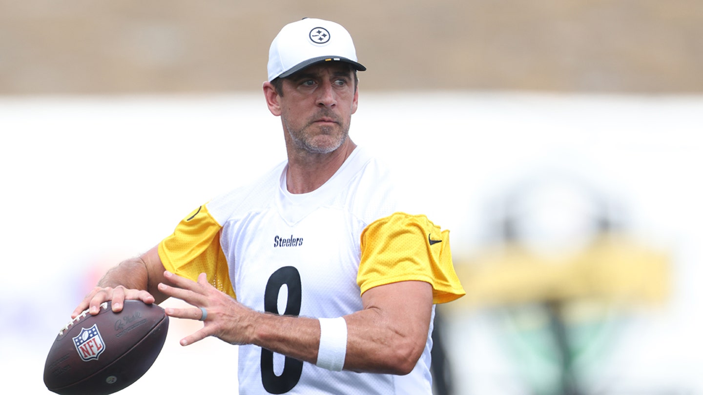 Pittsburgh Steelers Quarterback Aaron Rodgers (8) participates in exercises during training camp at Saint Vincent College. (Charles Leclaire-Preferred Pictures)