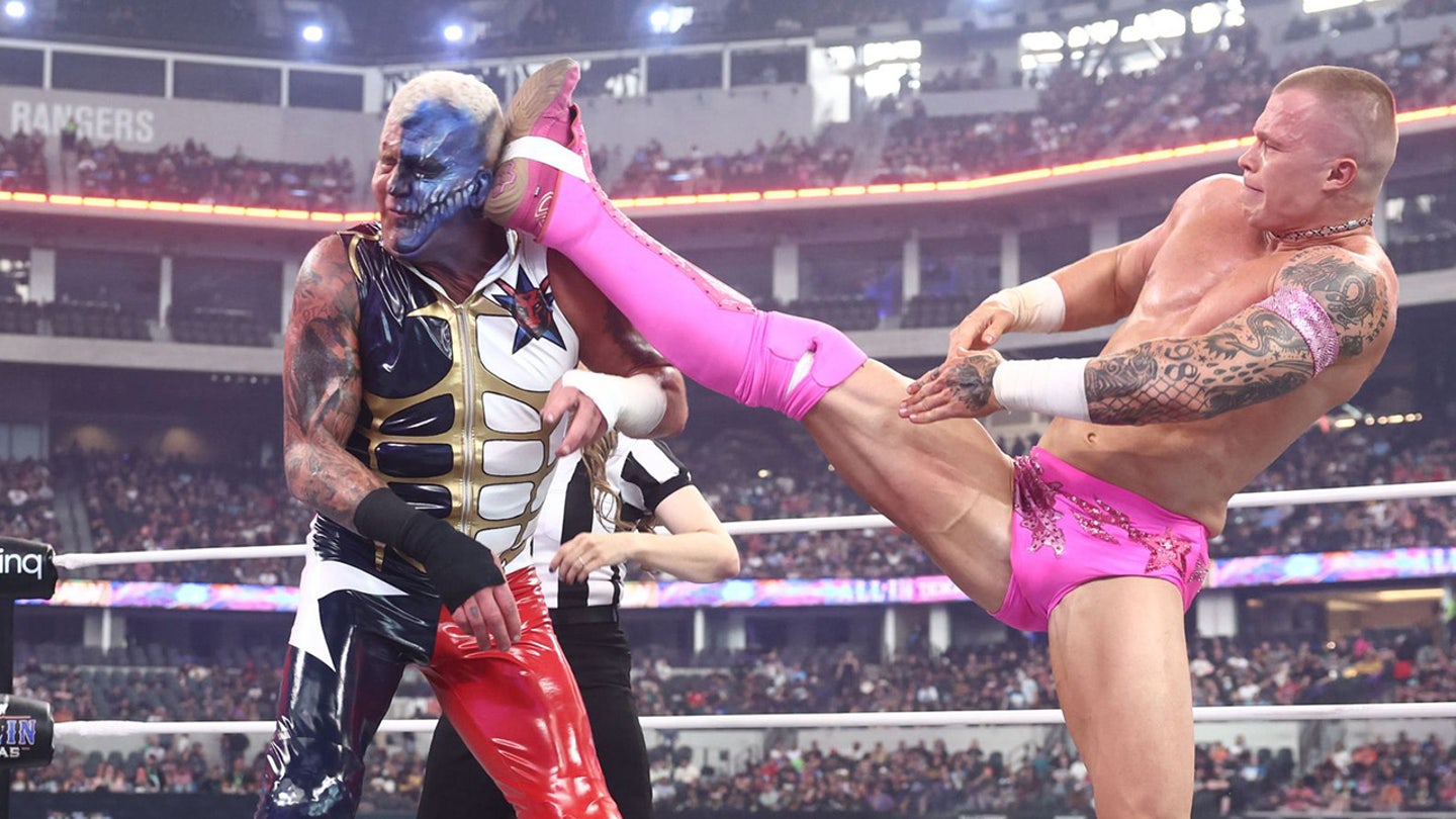 Kyle Fletcher kicks Dustin Rhodes in the head of AEW All in: Texas on July 12, 2025. (Ricky Havlik/Aew)