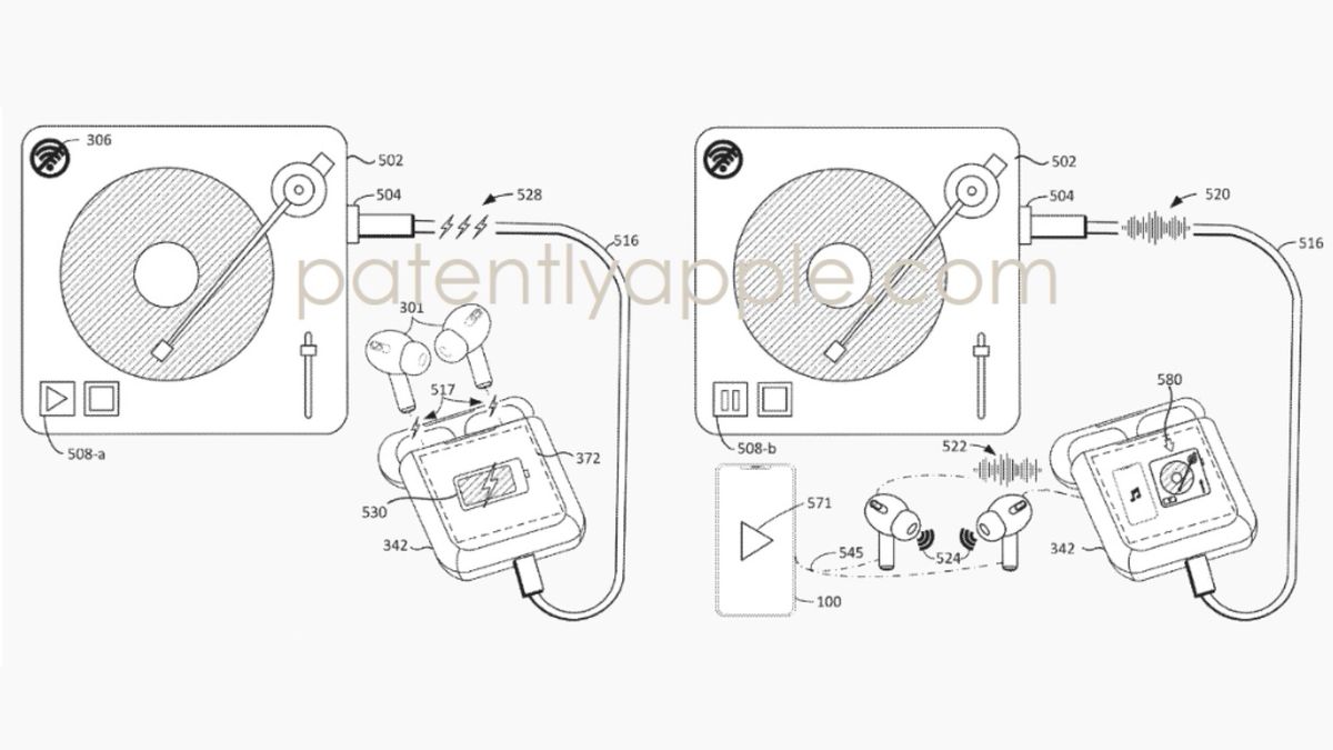 In the images delivered in the application, the AirPods case is connected via a cable to a turntable and then broadcast the sound from the case to AirPods. It is also shown to accept handwriting or apple pencil input on the touch screen.