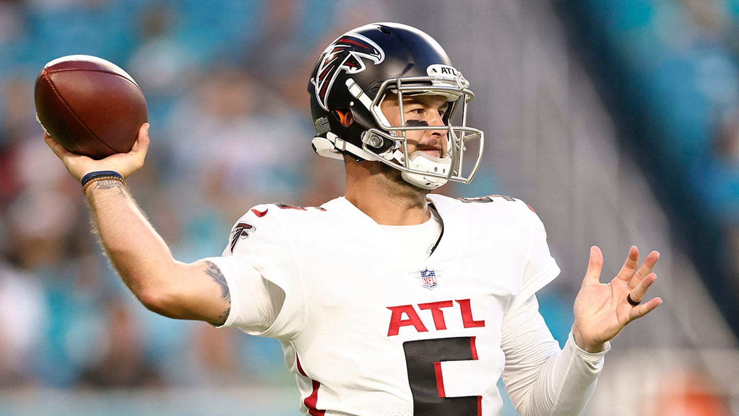 AJ McCarron (5) of the Atlanta Falcons looks to pass against the Miami Dolphins during a preseason game at Hard Rock Stadium on August 21, 2021 in Miami Gardens, Florida. (Michael Reaves/Getty Images)