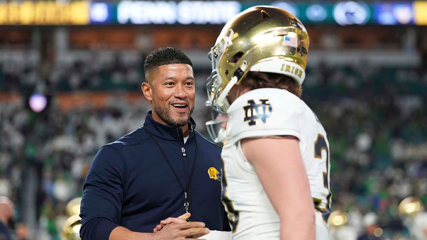 Notre Dame head coach Marcus Freeman greets a player before the Orange Bowl NCAA College Football Playoff semifinal game against Penn State on Thursday, Jan. 9, 2025, in Miami Gardens, Fla. (AP Photo/Rebecca Blackwell)