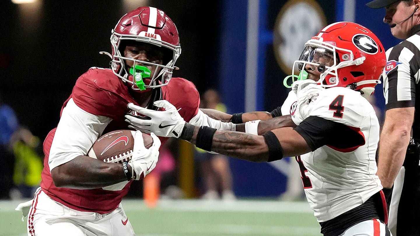 Alabama wide receiver Germie Bernard (5) uses a stiff arm to break a tackle by Georgia defensive back KJ Bolden (4) at Mercedes-Benz Stadium in Atlanta, Georgia on December 6, 2025. (Gary Cosby Jr./Tuscaloosa News)
