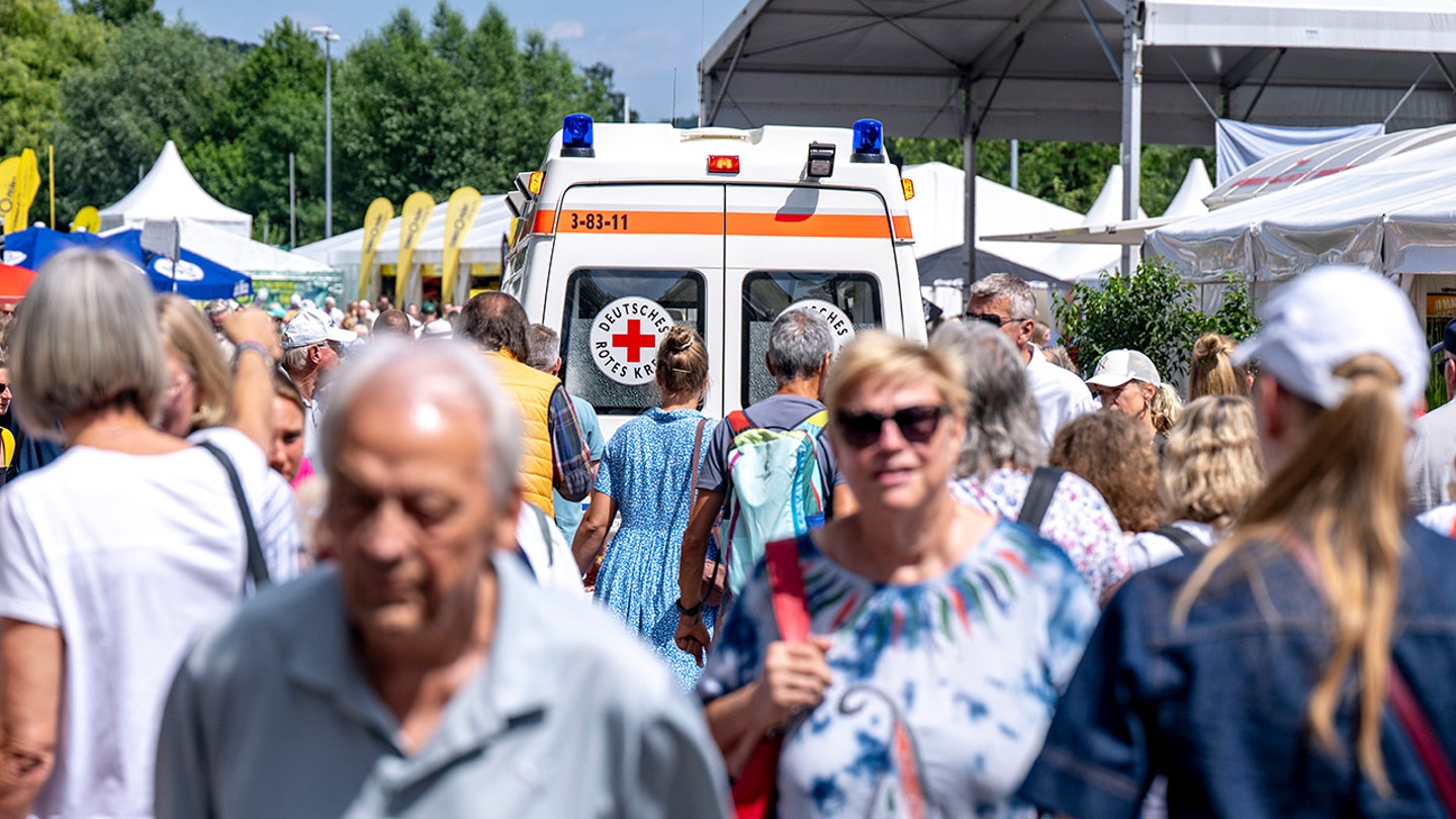 An ambulance from the German Red Cross runs through the crowd after a billboard loosened from the grandstand and fell into the spectator area under the Halle ATP tennis tournament in Halle, Germany, Wednesday 18 June 2025. (David Inderlied/DPA via AP)
