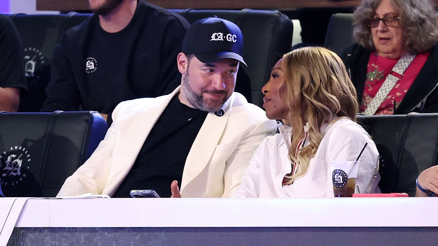Serena Williams and Alexis Ohanian during a match between the New York Golf Club and Los Angeles Golf Club at Sofi Center 17 March 2025 in Palm Beach Gardens, Fla. (Megan Briggs/TGL/TGL via Getty Images)