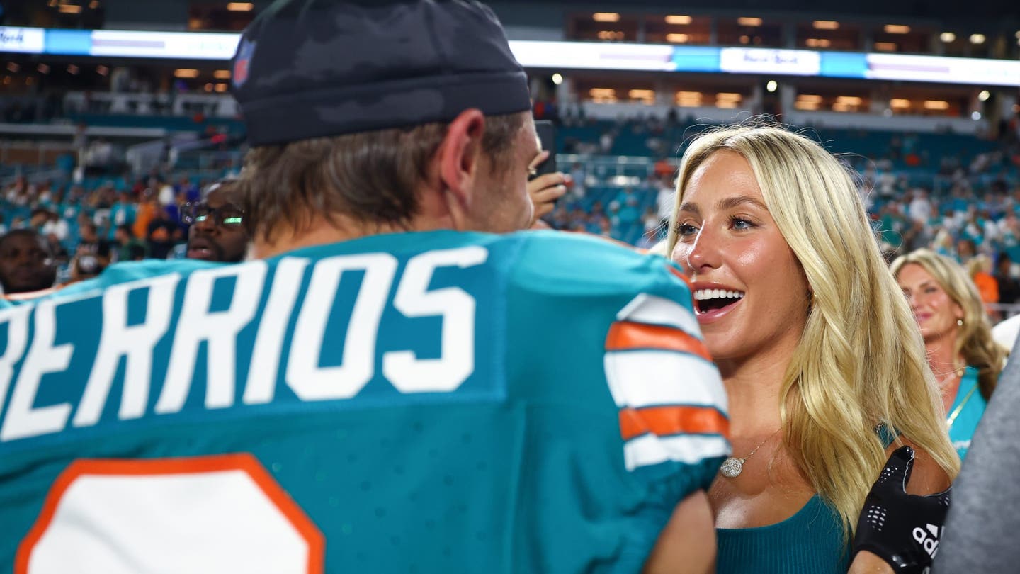 Braxton Berrios #0 from Miami Dolphins and Alix Earle Talk before a game against Buffalo Bills at Hard Rock Stadium on September 12, 2024 in Miami Gardens, Florida. (Megan Briggs/Getty Images)