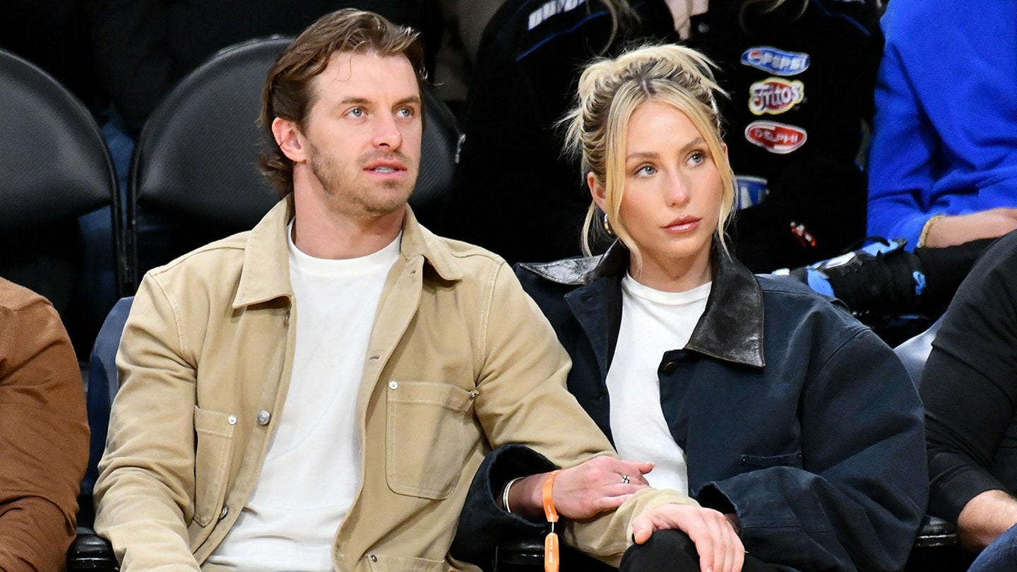 (LR) Braxton Berrios and Alix Earle participate in the Super Bowl LVIII preliminary name at Allegiant Stadium on February 11, 2024 in Las Vegas, Nevada. (Kevin Mazur/Getty Images to Roc Nation)