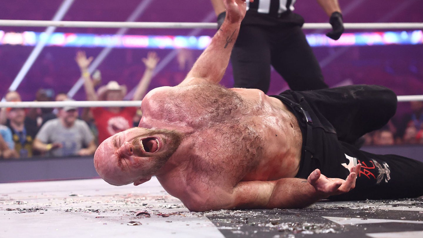 Jon Moxley wriggled with pain during a fight against Adam Page at Aew All in: Texas on July 12, 2025. (Ricky Havlik/Aew)