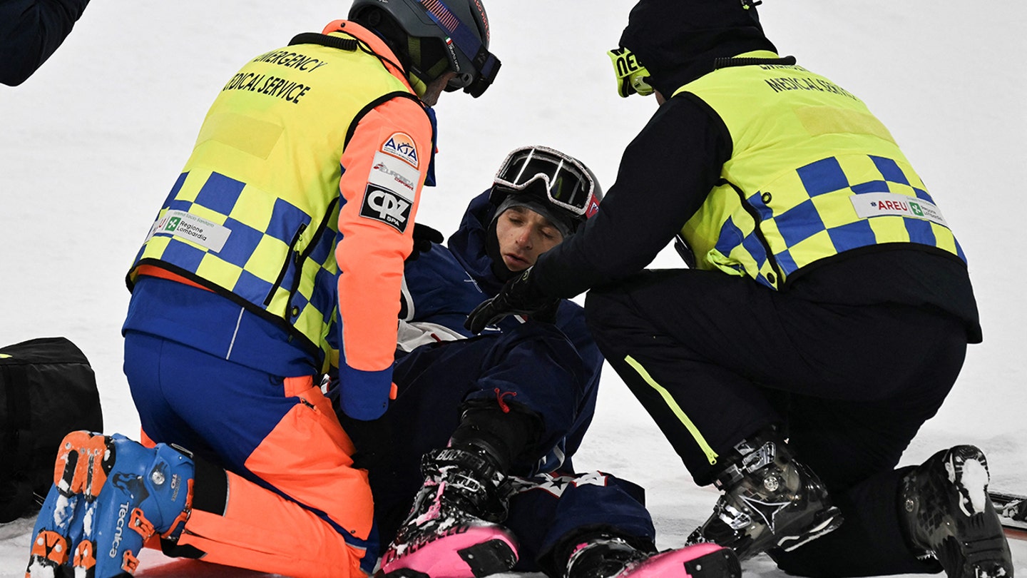 USA’s Nick Goepper receives medical attention after crashing while competing in freestyle skiing for the men’s freeski halfpipe final race 3 during the Milan Cortina 2026 Winter Olympics at the Livigno Snow Park, in Livigno (Valtellina), on February 20, 2026. (Jeff Pachoud/AFP via Getty Images)