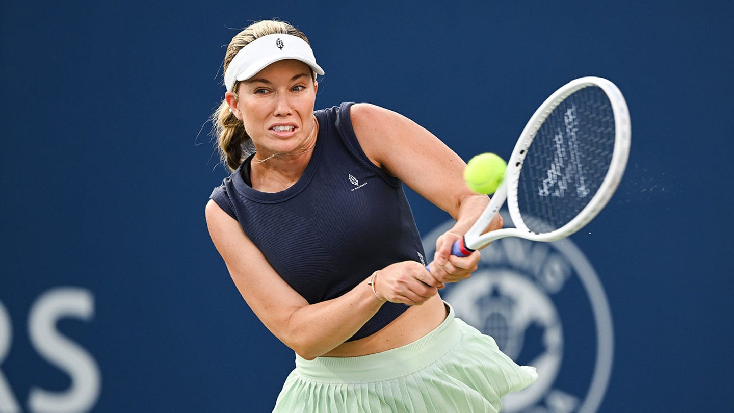 Danielle Collins (USA) returns the ball to Viktoriya Tomova (BUL) in the first round at IGA Stadium on July 27, 2025. (David Kirouac/Imagn Images)