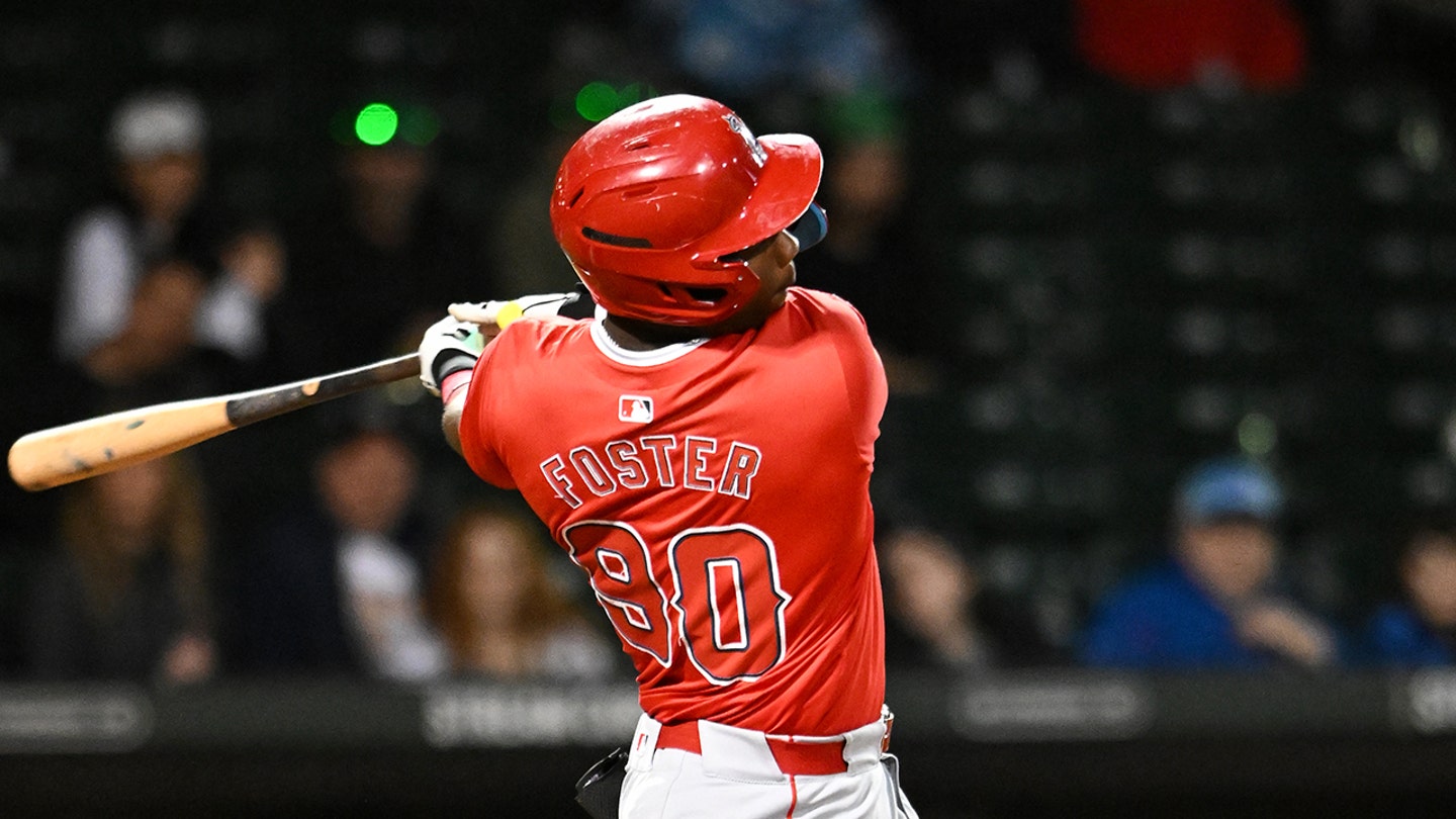 Rio Foster #90 of Los Angeles Angels Bats during the sixth round of a spring training Spring Breakout game against Chicago Cubs in Sloan Park on March 15, 2025 in Mesa, Arizona. (David Durochik/Diamond Images via Getty Images)
