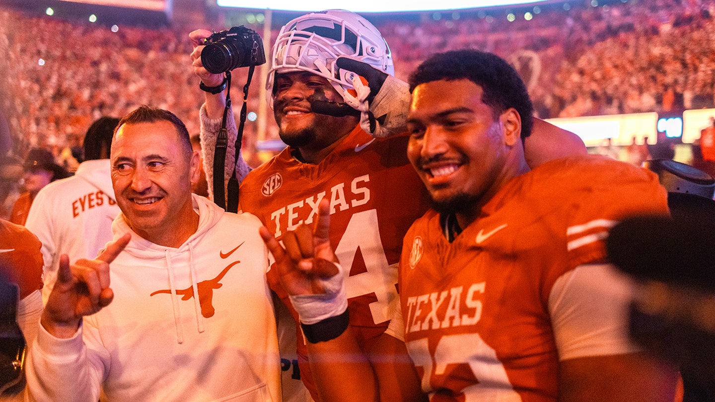 Left to right, Texas head coach Steve Sarkisian, offensive lineman Trevor Goosby and offensive lineman Brandon Baker celebrate after a win over Texas A&M in an NCAA college football game Friday, Nov. 28, 2025, in Austin, Texas. (AP Photo/Stephen Spillman)