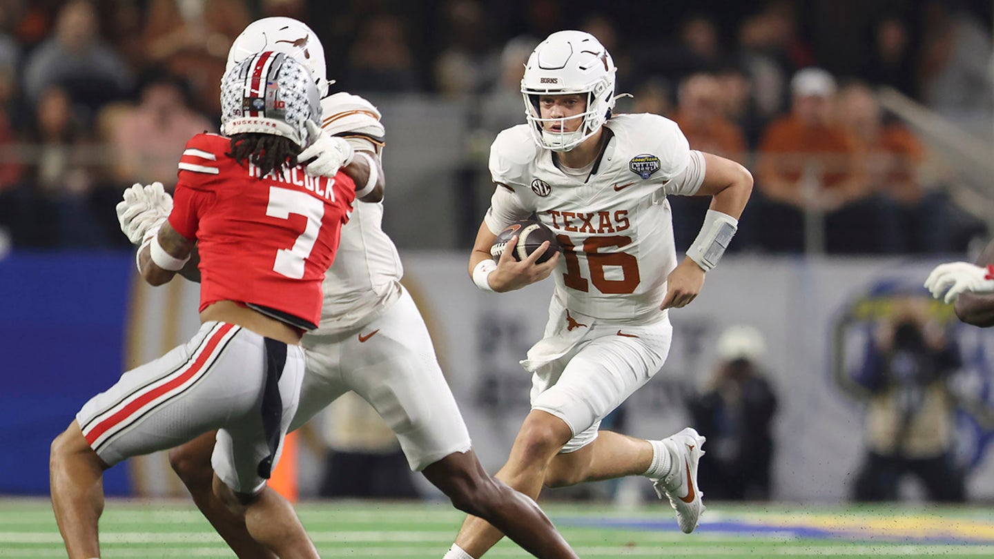Texas Quarterback Arch Manning (16) runs against Ohio State during the first half of the Cotton Bowl College Football Playoff SemiFinal Game, Friday 10. January 2025, in Arlington, Texas. (AP Photo/Gareth Patterson)