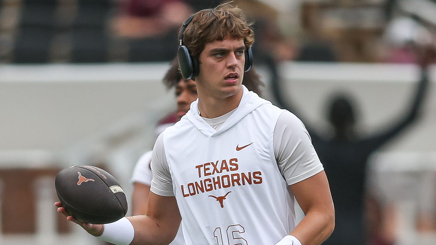Texas quarterback Arch Manning (16) warms up before an NCAA college football game Mississippi State in Starkville, Mississippi, Saturday, Oct. 25, 2025. (AP Photo/James Pugh)