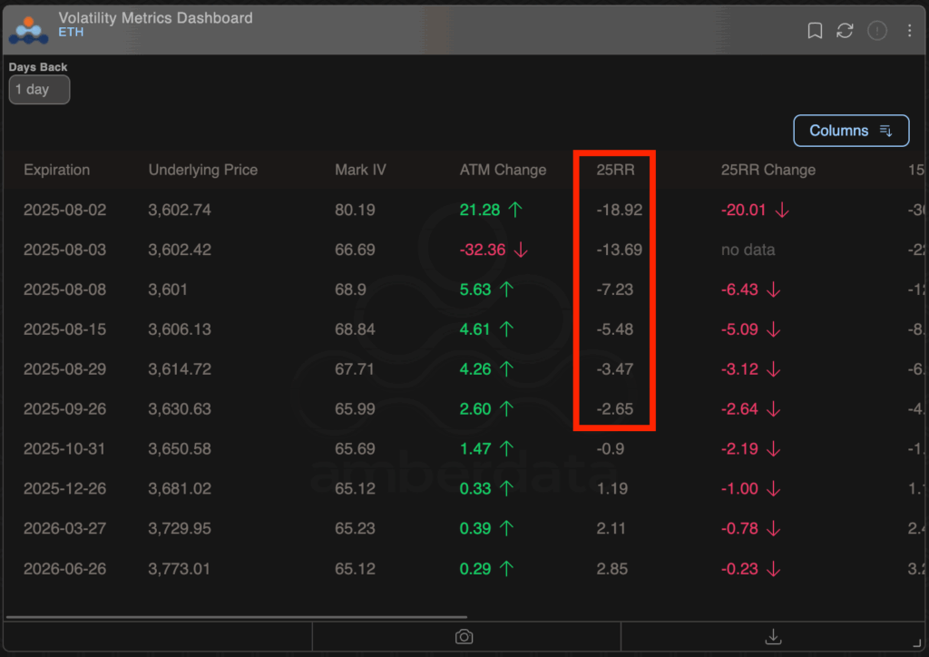 According to data from Amberdata, Ether’s 25 -Delta risk transfers for options that expire in August and September, traded by -2% to -7%. This means that put options that provide protection against drops in price has a 2% to 7% premium over call options, reflecting a apparent concern about a potential downward risk.