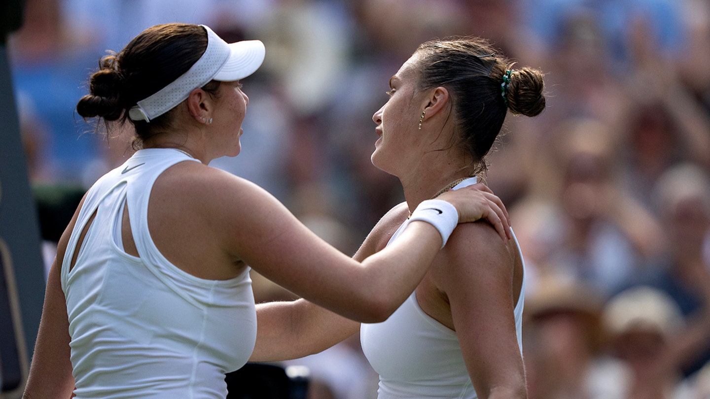 July 10, 2025; Wimbledon, UK; ARYNA Sabalenka on the web with Amanda Anisimova in the United States after their match on Day 11 on All England Lawn Tennis and Croquet Club. Mandatory Credit: Susan Mullane-Misted Pictures