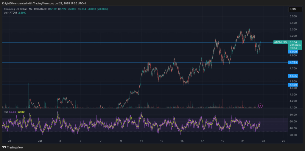 Atom fell from $ 5.26 to $ 4.98 between July 21 at 1 p.m. 11:00 and 22 July at. 10am UTC, and stood heavy resistance to $ 5.32 in the course of 15:00 trading lesson. Trade volumes rose to 1.79 million units before 16:00 when sellers overwhelmed, buy orders, leading to a clear technical breakdown.