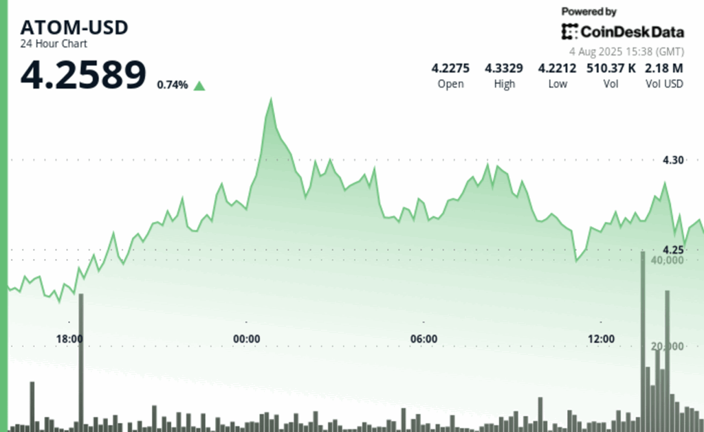 Atom swung within a $ 0.12 corridor between $ 4.22 and $ 4.33 – a 3% range that reflects the strategic positioning of the coin in the middle of Makrovind. Despite the intraday volatility, the price action was largely constructive, with bulls staged a breakout near Midnight UTC on August 4, pushing the token to a session high at $ 4.33. The rally was supported by heavy trading volume, peaking at 723,991 units during the upward wave before turning against opposition to the newly created high.
