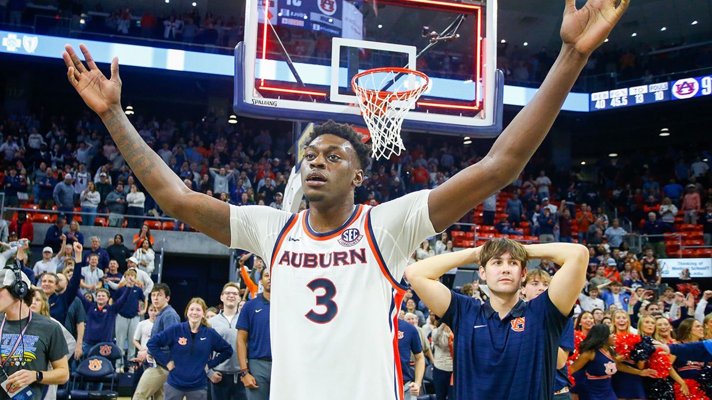 KeShawn Murphy of the Auburn Tigers reacts after officials ruled his last-second shot did not beat the shot clock to win the game against the Texas A&M Aggies at Neville Arena on January 6, 2026 in Auburn, Alabama. (Stew Milne/Getty Images)