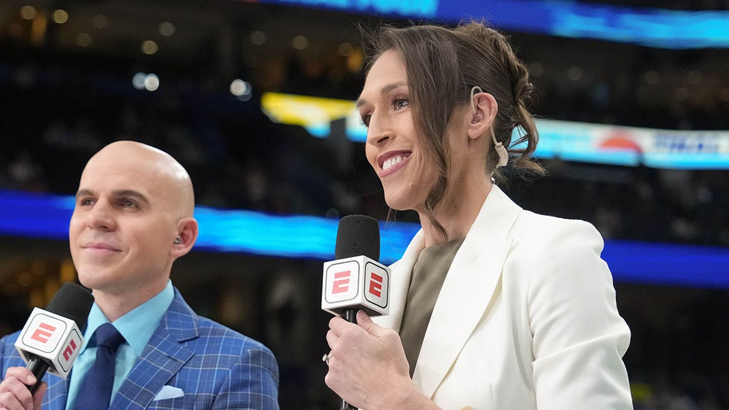ESPN -Annoncers Ryan Ruocco and Rebecca Lobo look at before the national championship of the women’s 2025 NCAA tournament between South Carolina Gamecocks and Connecticut Huskies in Amalie Arena. (Kirby Lee-Preferred Pictures)