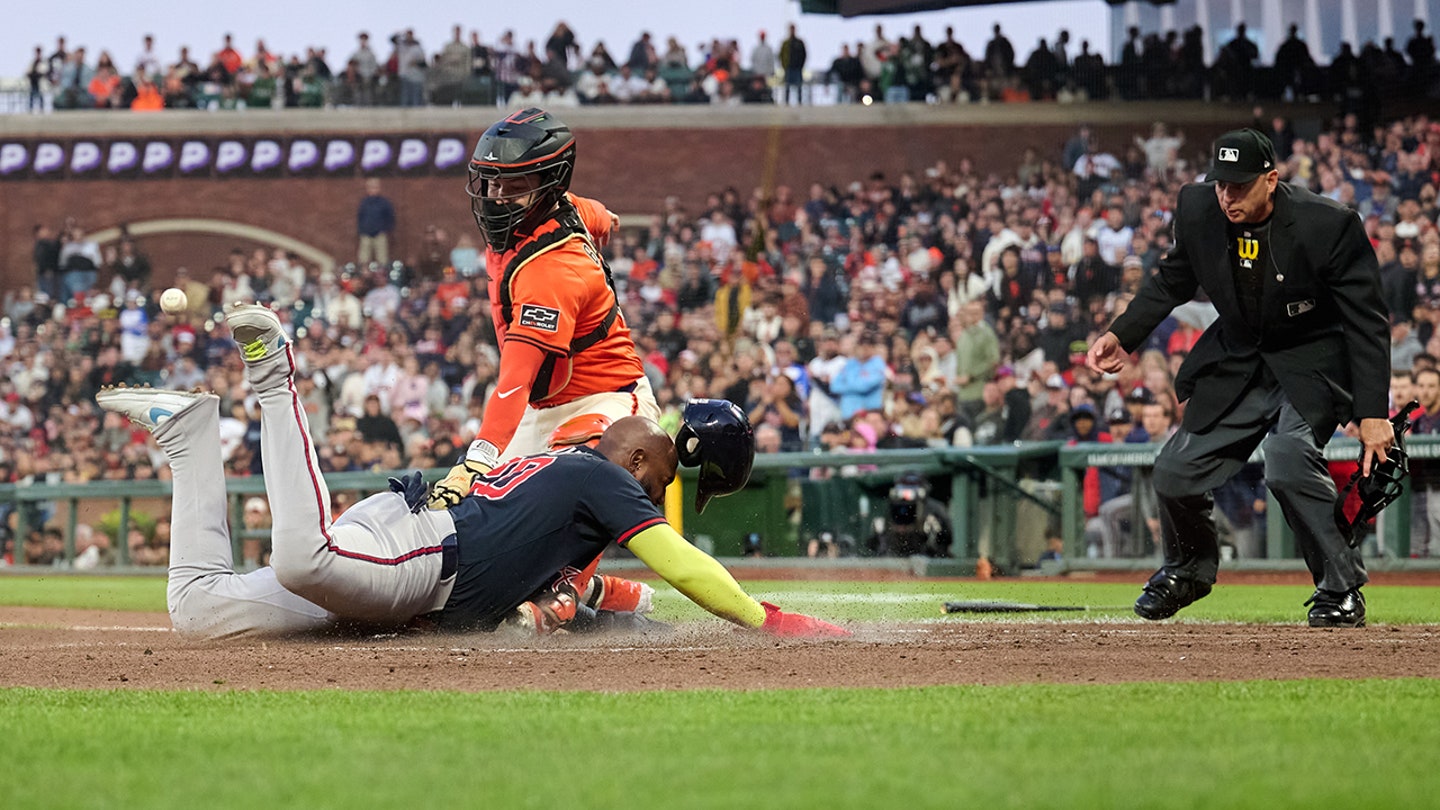 Atlanta Braves Designated Hitter Marcell Ozuna Jr. (20) Sure safely into the home against San Francisco Giants -Catcher Patrick Bailey (14) as Judge Andy Fletcher Watches during the fourth lap in Oracle Park in San Francisco 6 June 2025. (Robert Edwards/Imag photos)