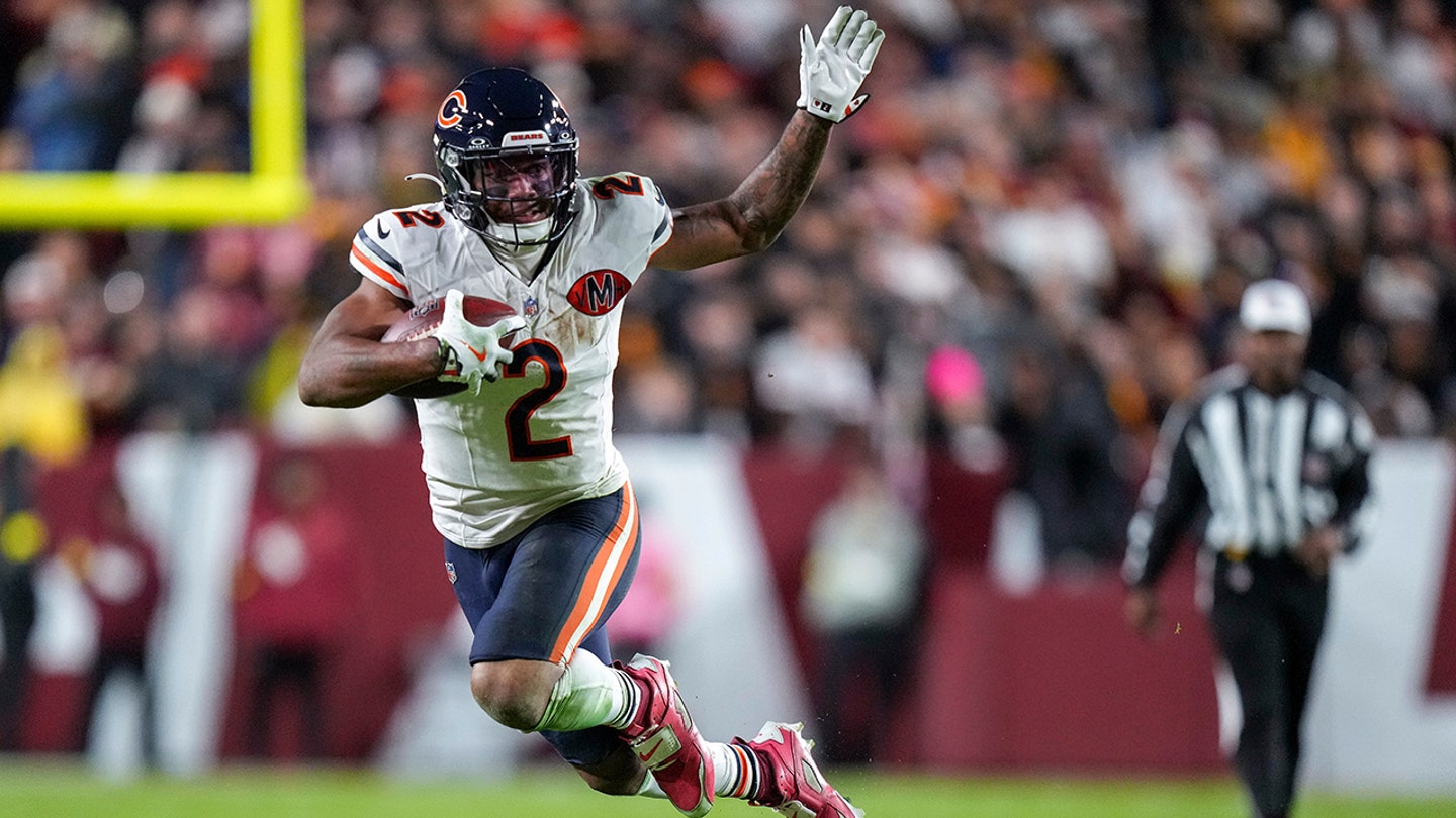 Chicago Bears wide receiver DJ Moore (2) jumps past Washington Commanders safety Jeremy Reaves (not seen) during the first half of an NFL football game on October 13, 2025 in Landover, Maryland. (AP Photo/Stephanie Scarbrough)