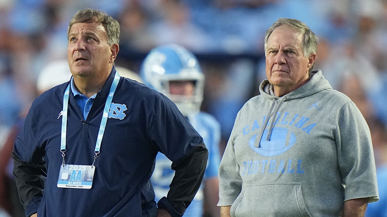 North Carolina football head Bill Belichick and General Manager Michael Lombardi in action, watching from the sidelines vs TCU at Kenan Memorial Stadium in Chapel Hill, North Carolina on September 1, 2025.