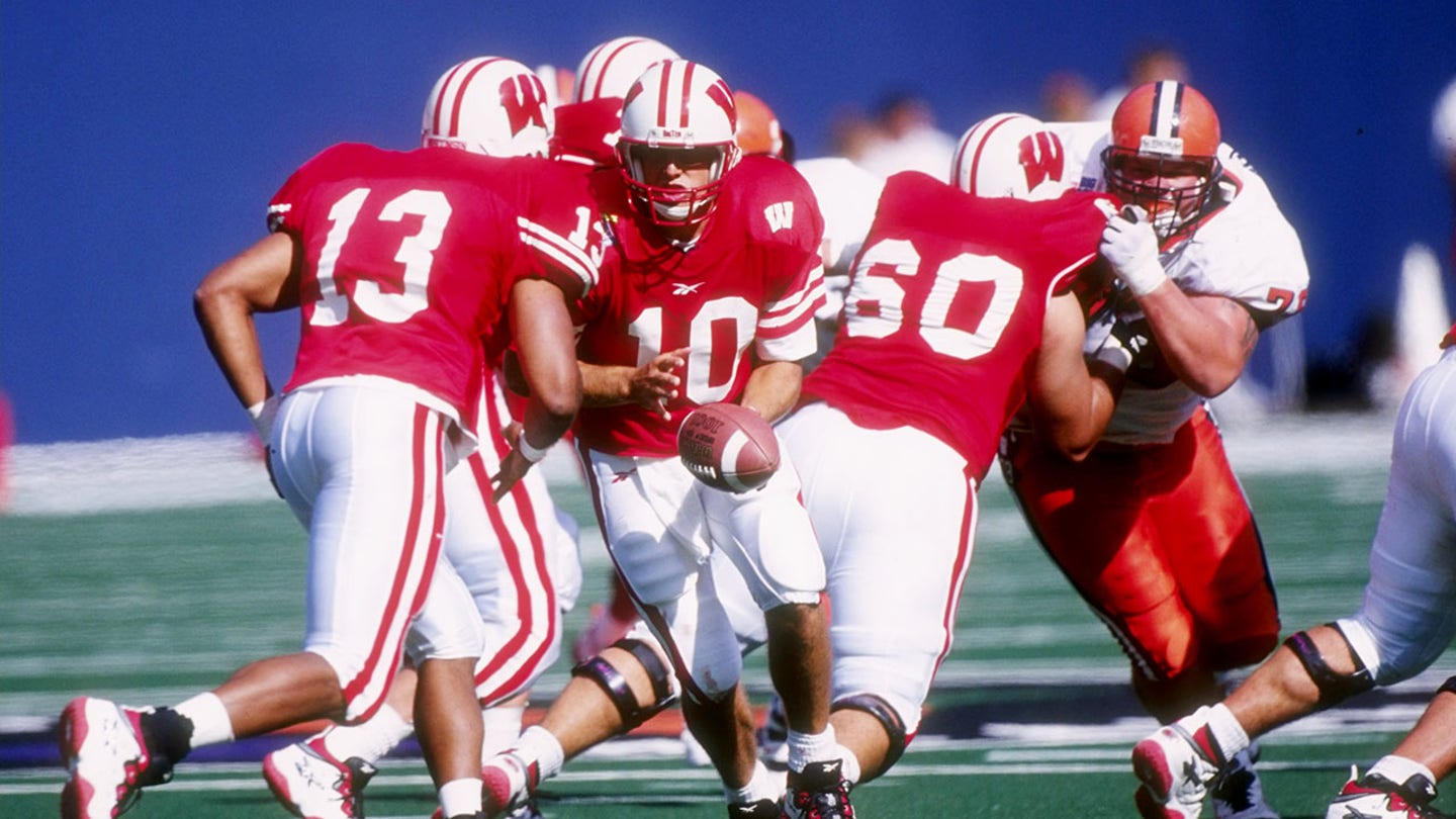 Quarterback Mike Samuel from Wisconsin Badgers (Center) hands of the ball to Bagback Carl McCullough (left) as Bill Ferrario blocks during the kickoff -classic match against Syracuse Orangemen at Giants Stadium in East Rutherford, New Jersey, August 24, 1997. (Getty Images)