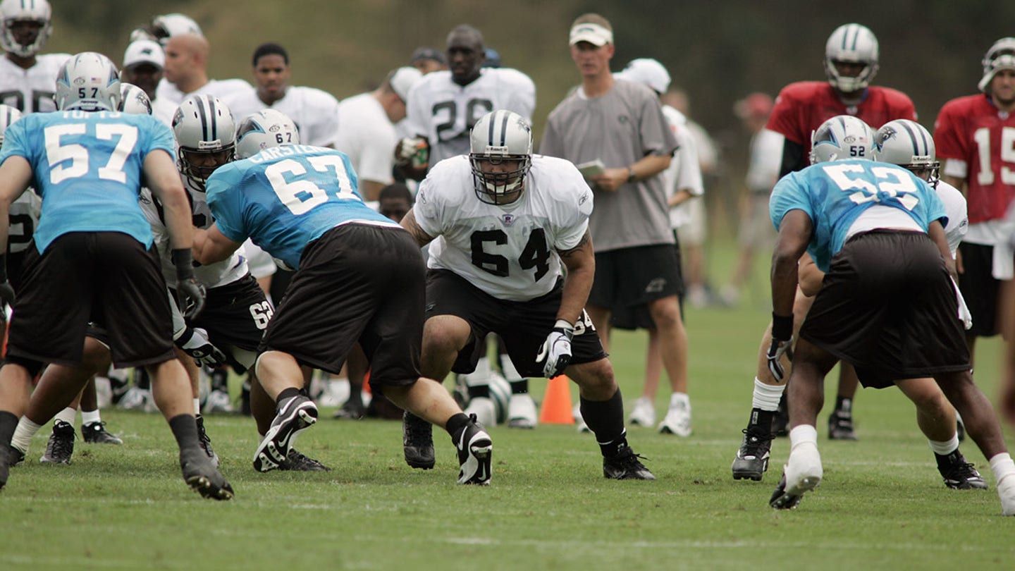 Bill Ferrario #64 from Carolina Panthers goes through exercises during training camp on July 30, 2005 at Wofford College in Spartanburg, South Carolina. (Grant Half -Person/Getty Images)