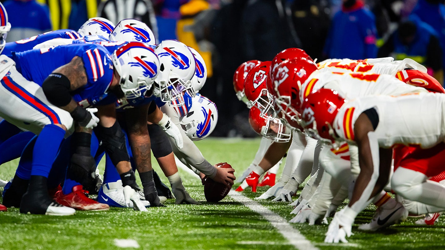 General view of the line of review as Buffalo Bills Center prepares to snap the ball against Kansas City Chiefs in 2024 AFC Divisional Round Game at Highmark Stadium on January 21, 2024 in Orchard Park, New York. (Mark J. Revilas/USA Today Sports)