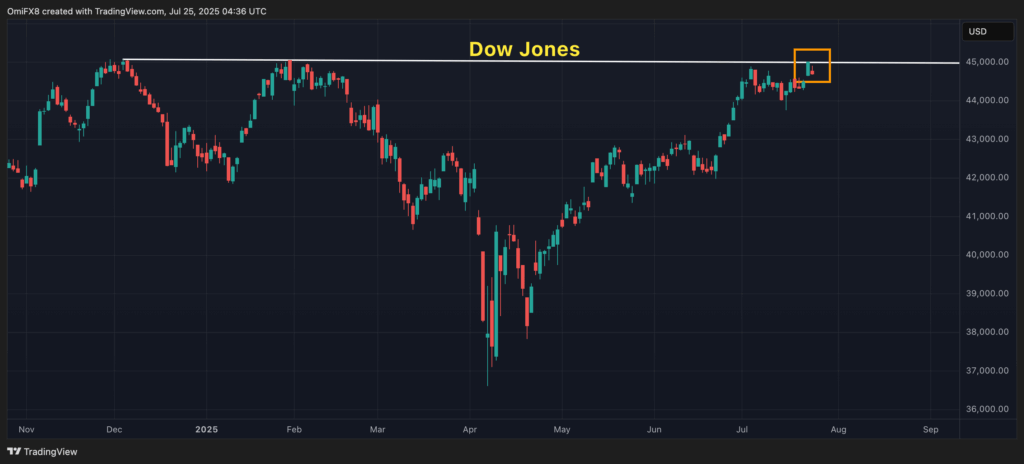 Over night, Wall Street’s Dow Jones index fell 0.70% in a sign that sellers were looking to restore their dominance at 45,000, the horizontal resistance identified by heights reached in December and January. A potential bearish reversing from here could sourper the mood of the crypto market.