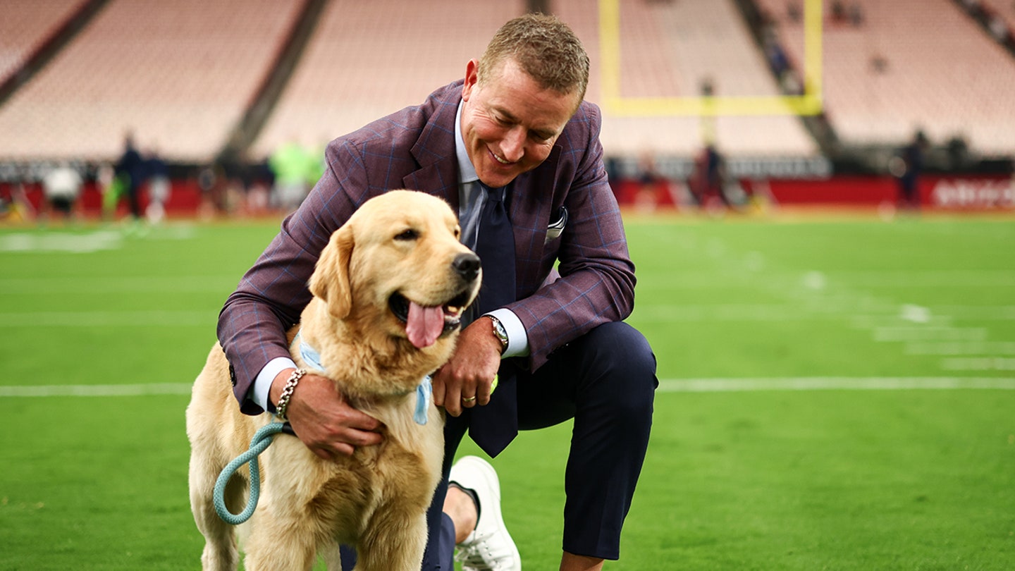 Prime Video commentator Kirk Herbstreit poses for a photo with his dog Peter prior to the game between the Seattle Seahawks and the Arizona Cardinals at State Farm Stadium on September 25, 2025 in Glendale, Arizona. (Kevin Sabitus/Getty Images)