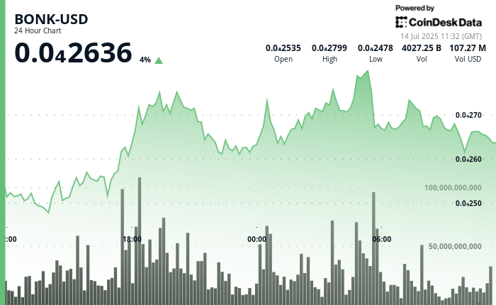 Bonk also experienced a 3% turn during the last 60-minute session between 09:37 and 10:36 AM, ranging from $ 0.0000260 to $ 0.0000268. While short earnings ran prices for session low around $ 0.0000260, renewed buying interest stabilized the market quickly.