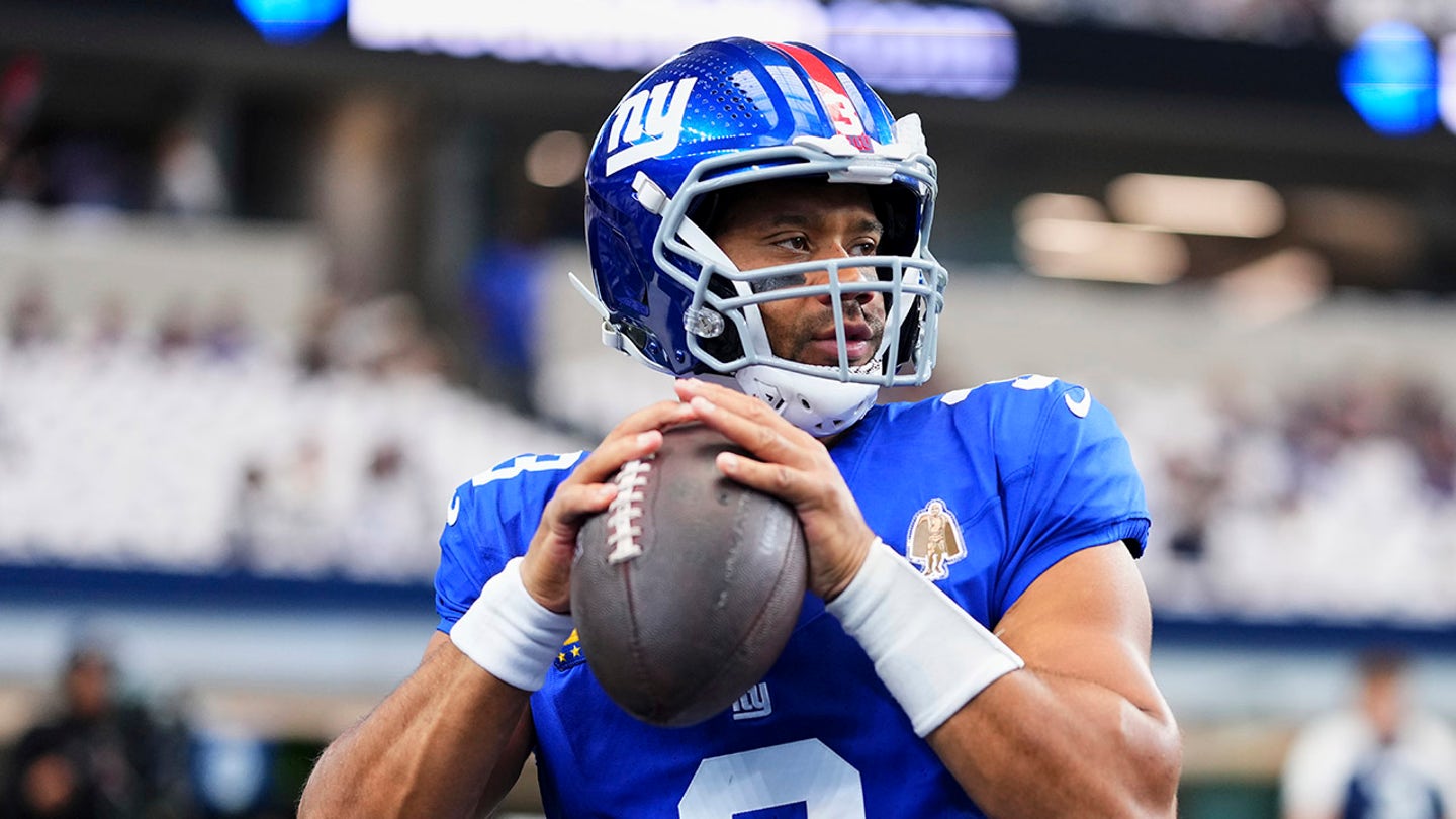 Russell Wilson from New York Giants warms up before kickoff against Dallas Cowboys during an NFL football match at AT&T Stadium on September 14, 2025 in Arlington, Texas. (Cooper Neill/Getty Images)