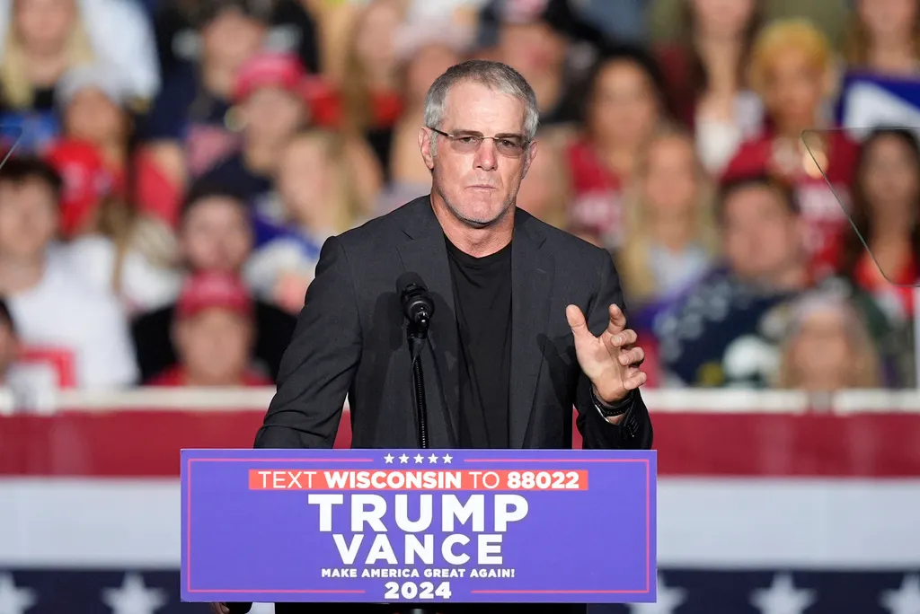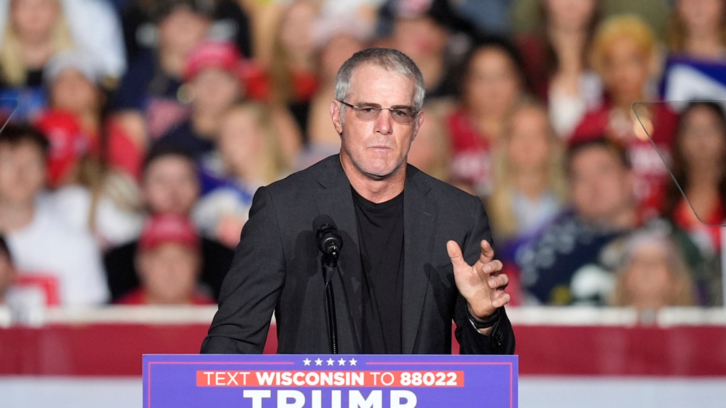 Former Green Bay Packers quarterback Brett Favre speaks in front of former President Donald Trump, the Republican presidential candidate, at a campaign rally at the Resch Center on Oct. 30, 2024, in Green Bay, Wis. (AP Photo/Alex Brandon)