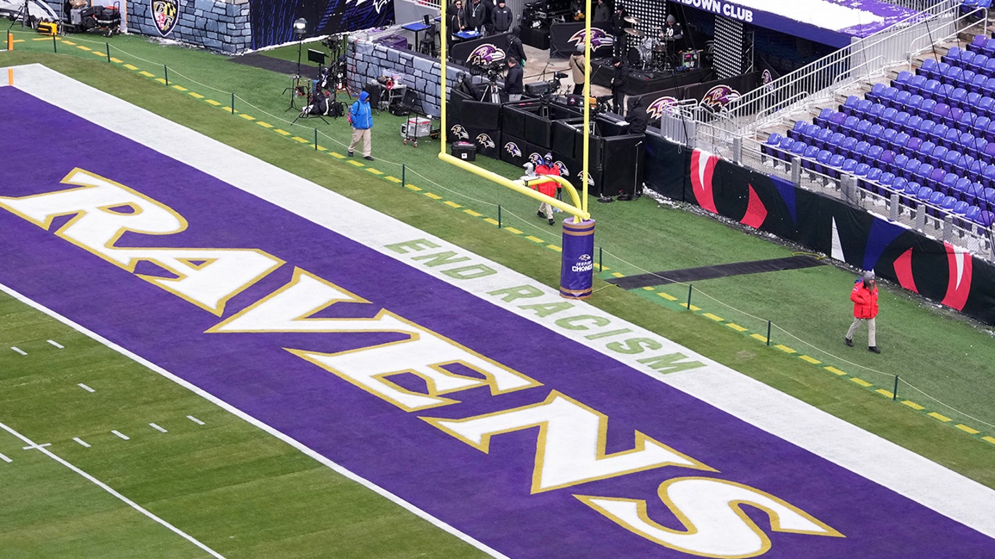 The Baltimore Ravens logo and words end racism in the final zone at M&T Bank Stadium on January 20, 2024 in Baltimore, Maryland. (Kirby Lee/Getty Images)