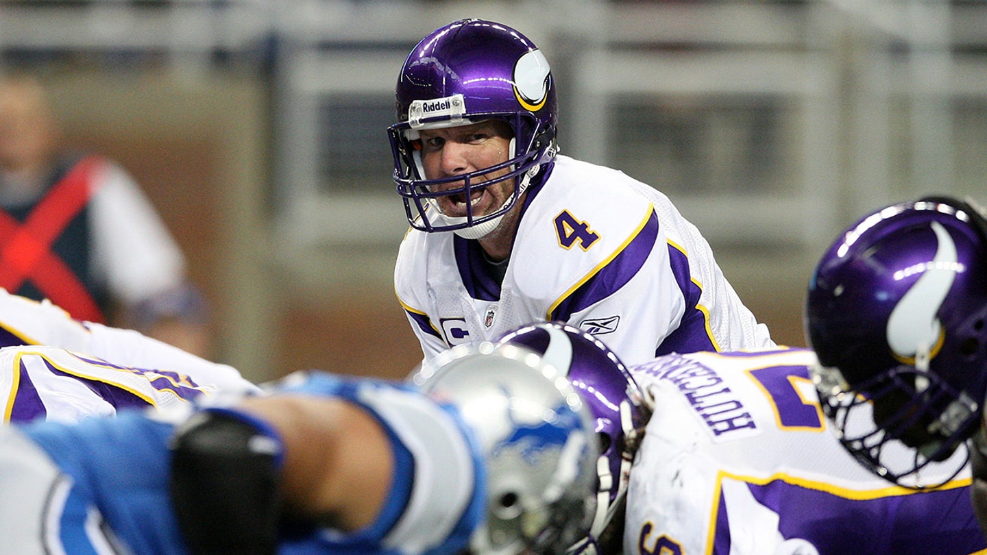 Minnesota Vikings Quarterback Brett Favre (4) calls the Snap count behind the center during the third quarter against the Detroit Lions at Ford Field. (Leon Halip/USA Today Sports)