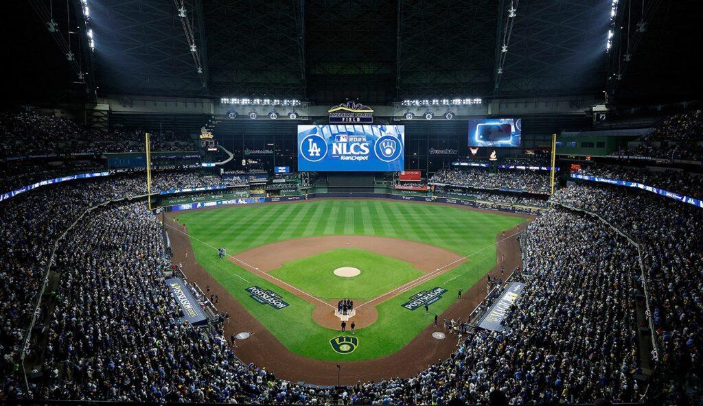 A general view of the American Family Field outfield prior to Game 1 of the National League Championship Series between the Los Angeles Dodgers and the Milwaukee Brewers on Monday, Oct. 13, 2025, in Milwaukee, Wisconsin. (Aaron Gash/MLB Photos via Getty Images)