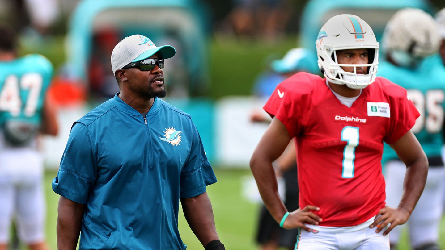 Miami Dolphins -Trainer Brian Flores and Quarterback Tua Tagovailoa (Susan Stocker/South Florida/Tribune News Service via Getty Images)