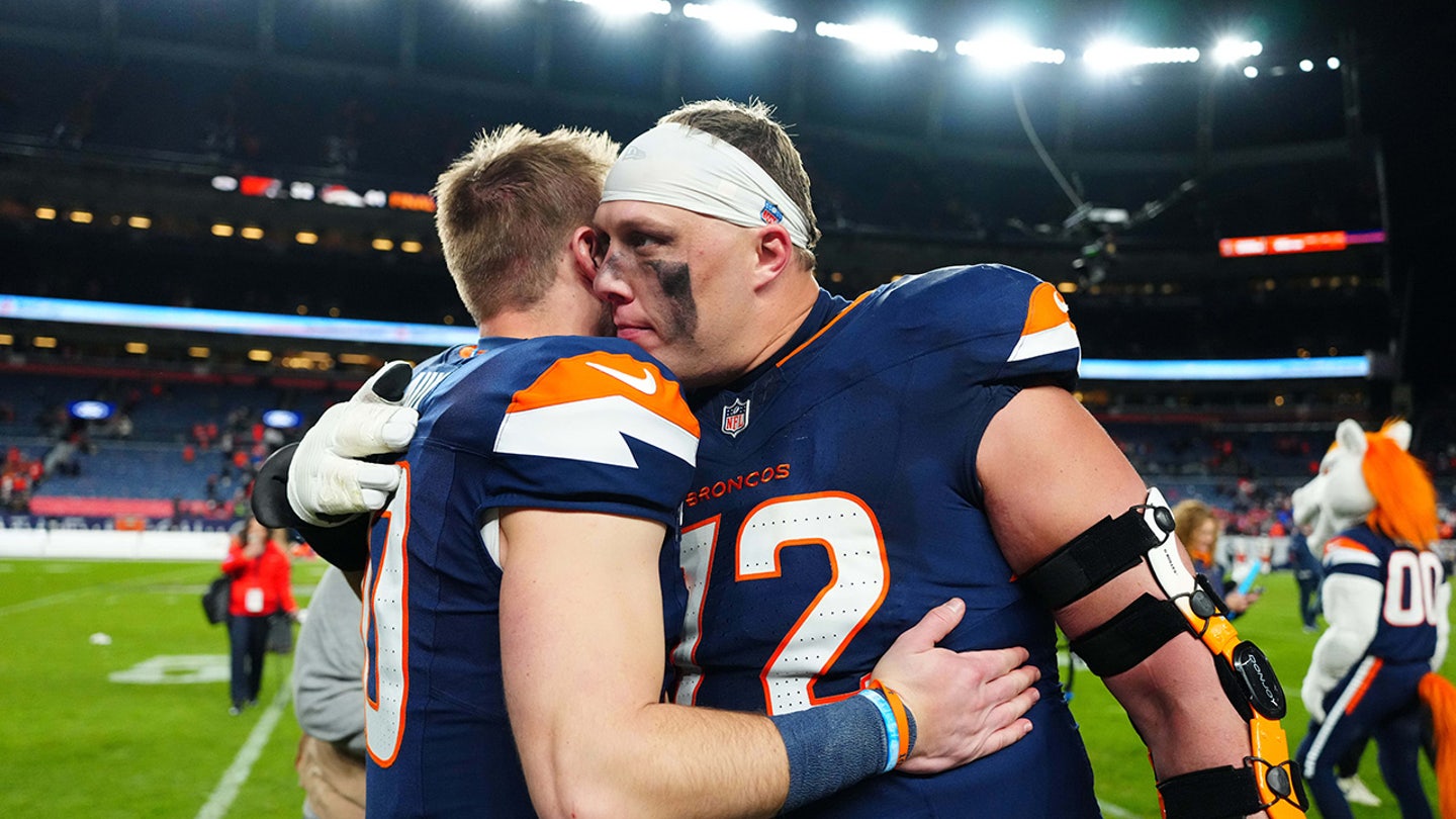 Denver Broncos Offensive Tackle Garett Bolles (72) squeezes quarterback bo nix (10) after the victory against Cleveland Browns at Empower Field at Mile High. (Ron Chenoy-Preferred Pictures)