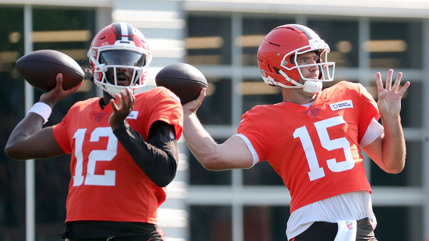 Cleveland Browns Quarterback Joe Flacco (15) and Quarterback Shedeur Sanders (12) Looking down Downfield during NFL training camp at Crosscountry MortGage Campus, Wednesday 30 July 2025, in Berea, Ohio. (Jeff Lange / USA Today Network via iMagn -Pictures)