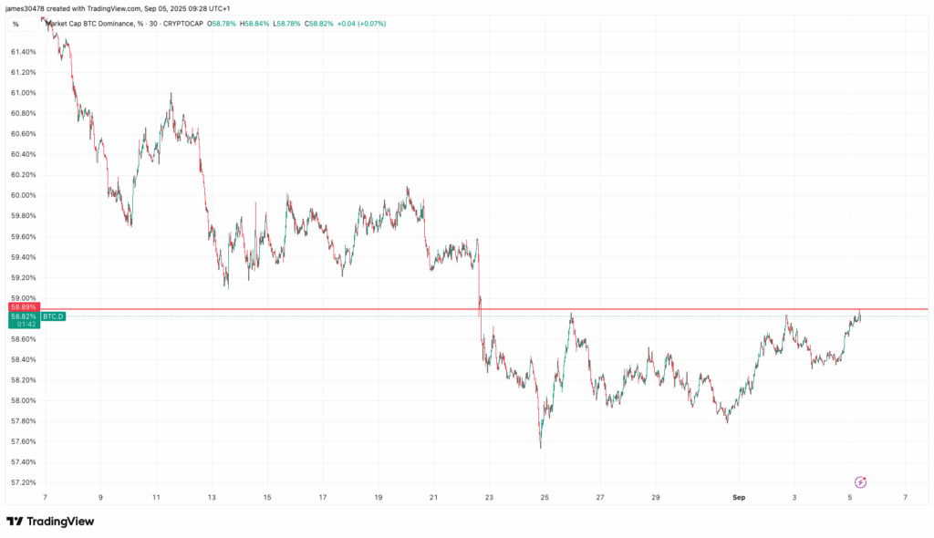 Bitcoin’s market dominance, representing its share of the total crypto market, also climbing up to a two -week height of almost 59%, up from a low level of 57.5%. It points to renewed capital inflow in Bitcoin, a shift from the recent market dynamics characterized by whales rotating out of BTC and to Ether.