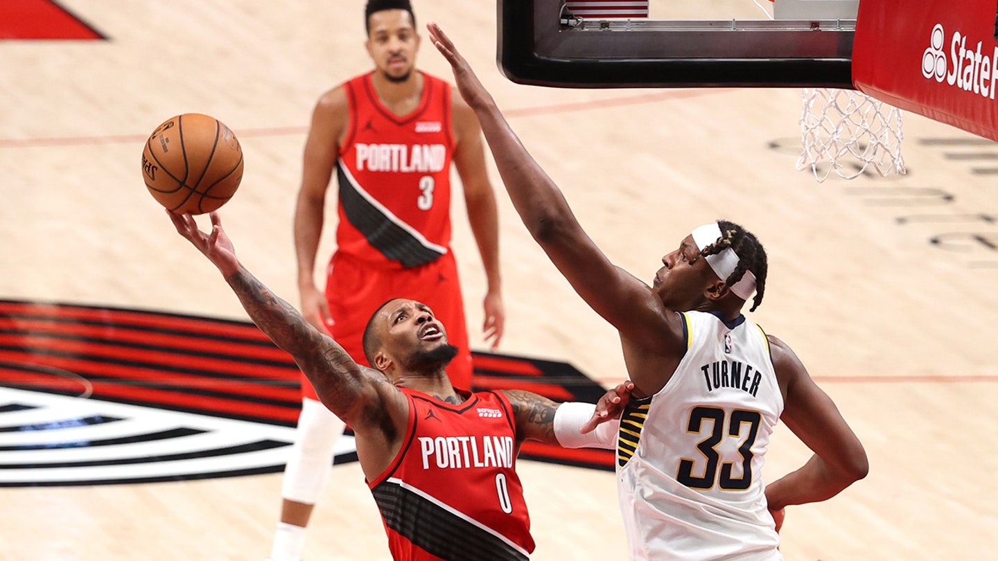 Damian Lillard from Trail Blazers takes a shot against Myles Turner from Indiana Pacers at Moda Center on January 14, 2021 in Portland, Oregon. (Abbie Parr/Getty Images)
