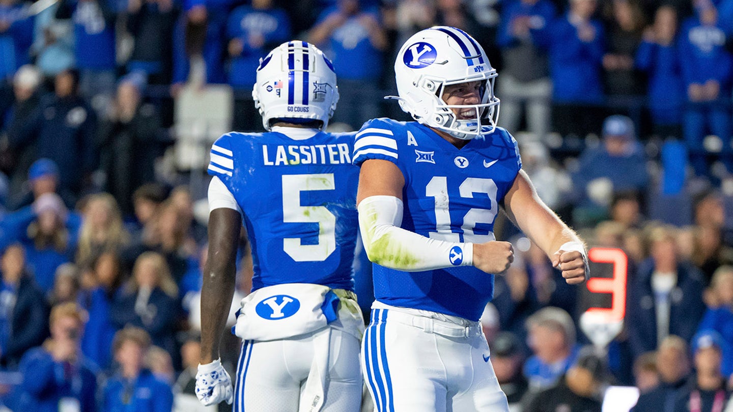 BYU -Grees receive Darius Lassiter (5) and quarterback Jake Retzlaff (12) celebrate after Retzlaff ran for a touchdown in the first half of a NCAA College -Football match against Oklahoma State, Friday 18 October 2024, in Provo, Utah. (Spenser Heaps/AP -Photo)