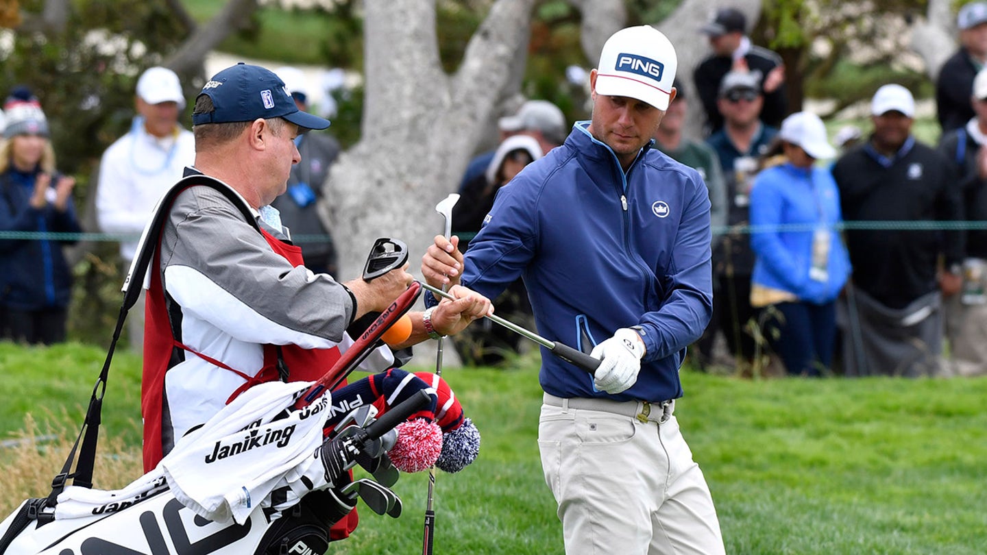 Harris English Excheses Clubs with his Caddy Eric Larson on the 5th hole during the third round of the US Open Golf Tournament in 2019 at Pebble Beach Golf Links. (Michael Madrid/USA Today Sports)