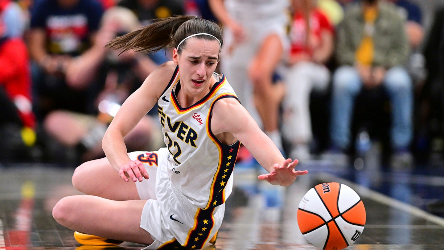Indiana Fevers Caitlin Clark goes after a loose ball under the Golden State Valkyries game on Wednesday, July 9, 2025 in Indianapolis. (AP Photo/Doug McSchooler)